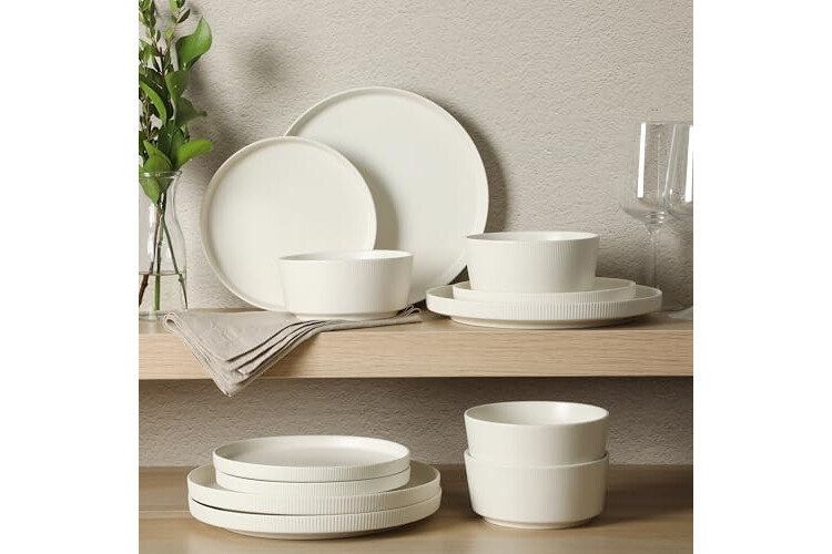 Gibson Home Dempsey Road 12-Piece Stoneware Dinnerware Set – Service for 4, Round White Plates and Bowls, Durable Solid Color Modern Embossed Dish Set, Microwave & Dishwasher Safe
