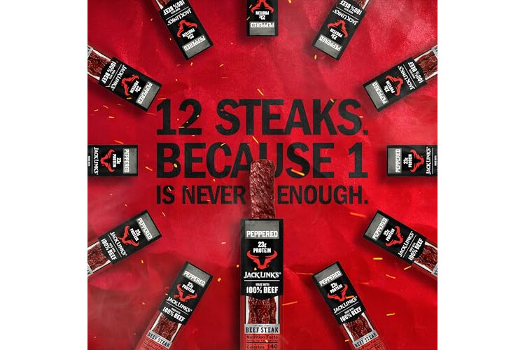 Jack Link's Peppered Beef Jerky Steaks - Ready to Eat Real Meat Protein Snacks - 23g Protein per Serving - Made with 100% Real Beef - (12 Pack) 2 oz Meat Snacks