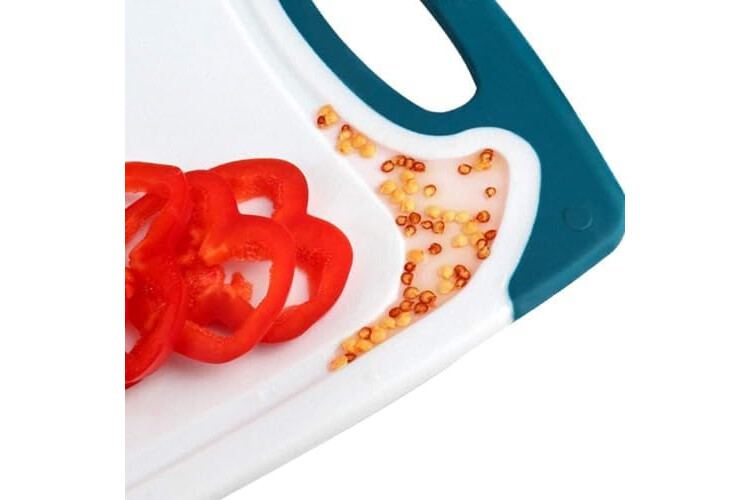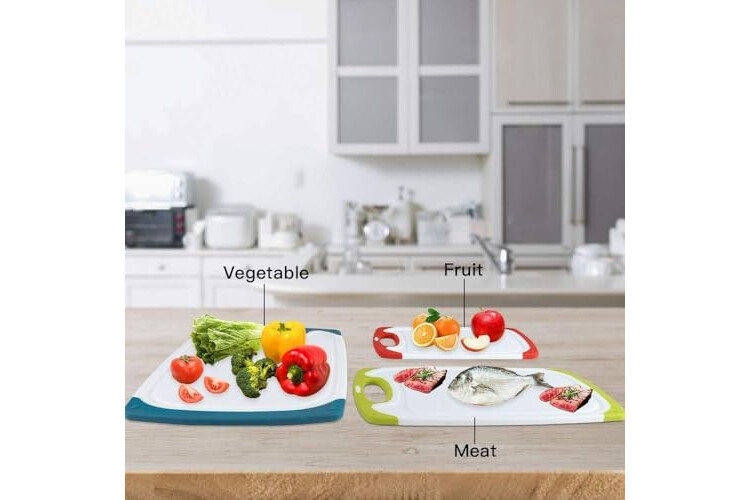 NON-SLIP & JUICE GROOVES: equipped with four nonslip rubber feet on bottom, these plastic cutting boards is much safer for you to cut on. The deep juice groove collects excess liquids, preventing spills.