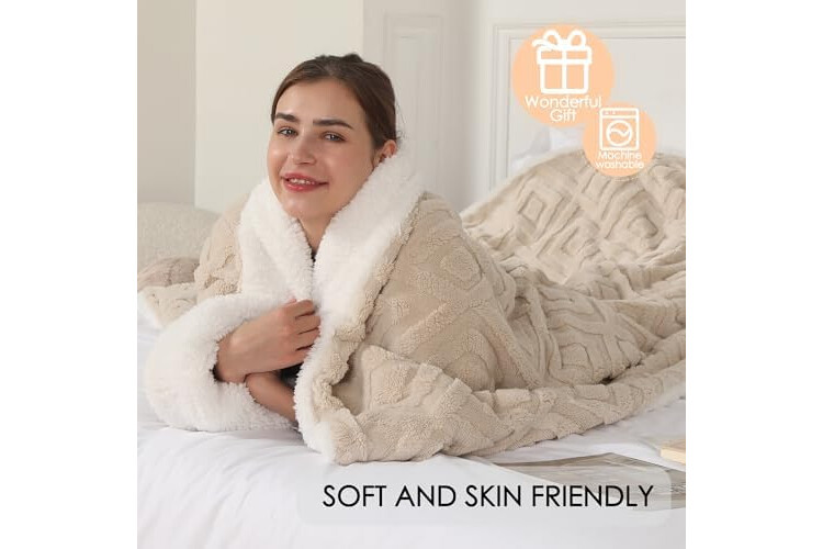 Electric Heated Blanket, 3D Patterned Diamond Grid, Twin Size Sherpa Super Cozy Heated Blanket with 5 Heating Levels & 10 Hours Auto Off, Light Khaki