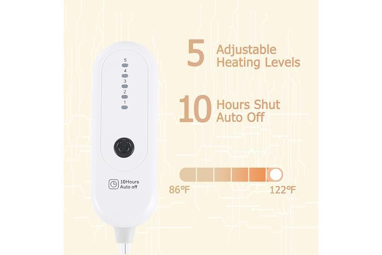 Convenient & Comfortable: Easy to use controller, which has 5 heating settings (86°F-122°F) and 10 hours auto-off function to choose your own perfect comfort. Built-in U-shape heating wires are uniquely placed for even heat distribution that will offer you instant warmth