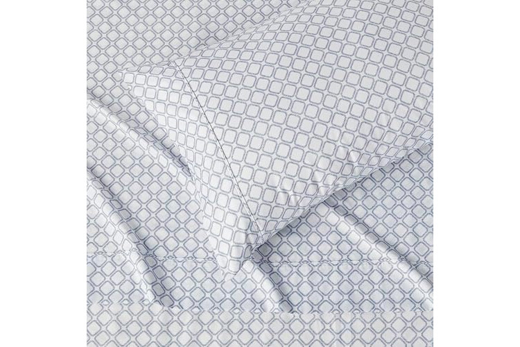 Bed sheet set in an Aqua print creates a cozy sleeping space