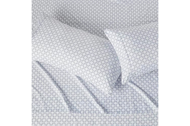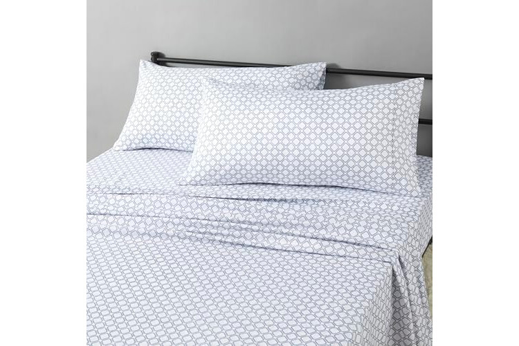• Bed sheet set in an Aqua print creates a cozy sleeping space