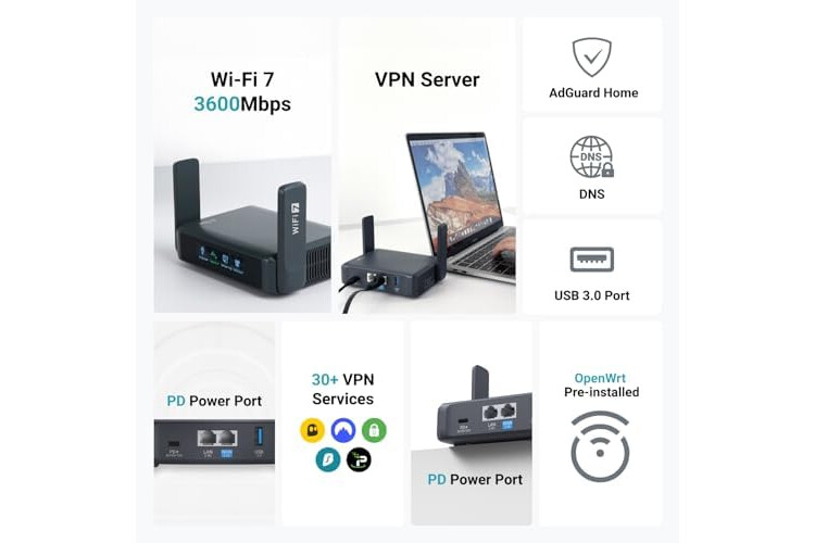 【OpenWrt 23.05 FIRMWARE】The Slate 7 (GL-BE3600) is a high-performance Wi-Fi 7 travel router, built with OpenWrt 23.05 (Kernel 5.4.213) for maximum customization and advanced networking capabilities. With 512MB storage, total customization with open-source freedom and flexible installation of OpenWrt plugins.