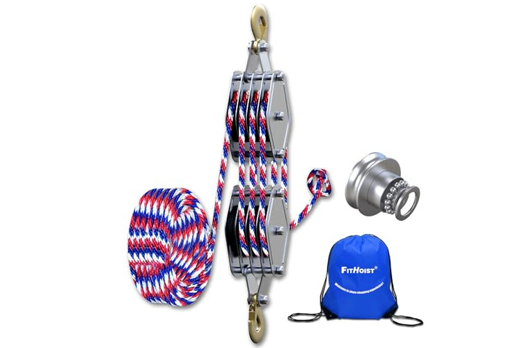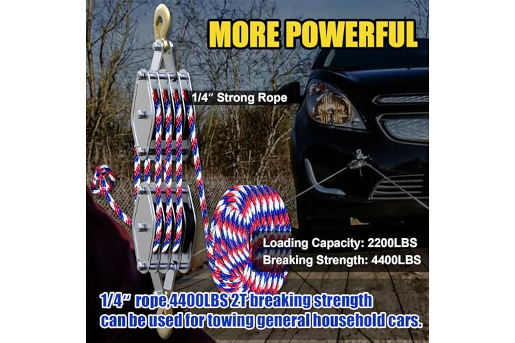 【4 x Pulleys】Fithoist Block and tackle pulley system 3/8 rope, More durable and load-bearing than triple pulley set; 4400LBS 2T breaking strength, can be used for towing general household cars.