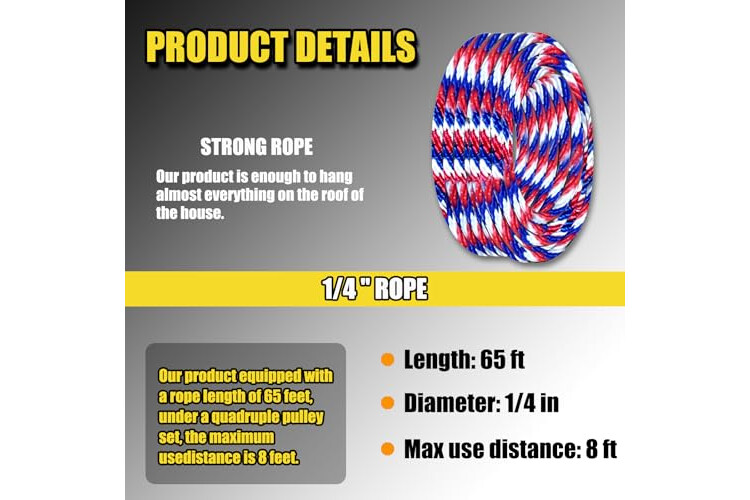 【65Ft Rope】Fithoist Rope Pulley System equipped with a rope length of 65 feet, under a quadruple pulley set, the maximum use distance is 8 feet, which is enough to hang almost everything on the roof of the house.