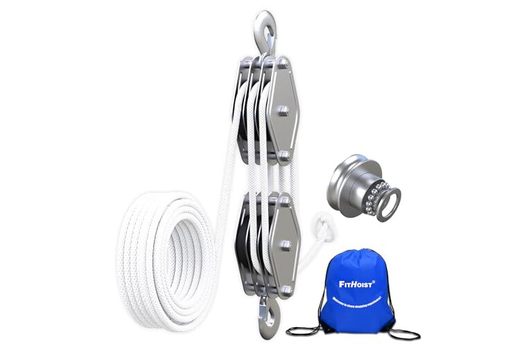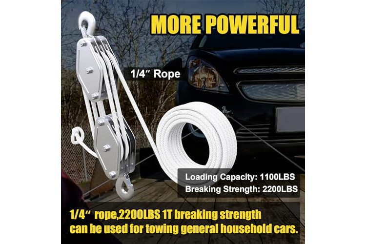 【3 x Pulleys】Fithoist Block and tackle pulley system rope, More durable and load-bearing than triple pulley set; 2200LBS 1T breaking strength, can be used for towing general household cars.
