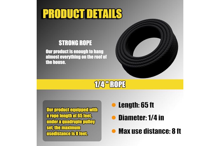 【New Upgrade Pulley System】Metal bearing structure & 65 ft of 6mm poly rope, 4400 lbs breaking strength, 1000 lbs load cap, 7:1 lifting power, 8 ft maximum use distance, enough to hang almost everything from the roof.