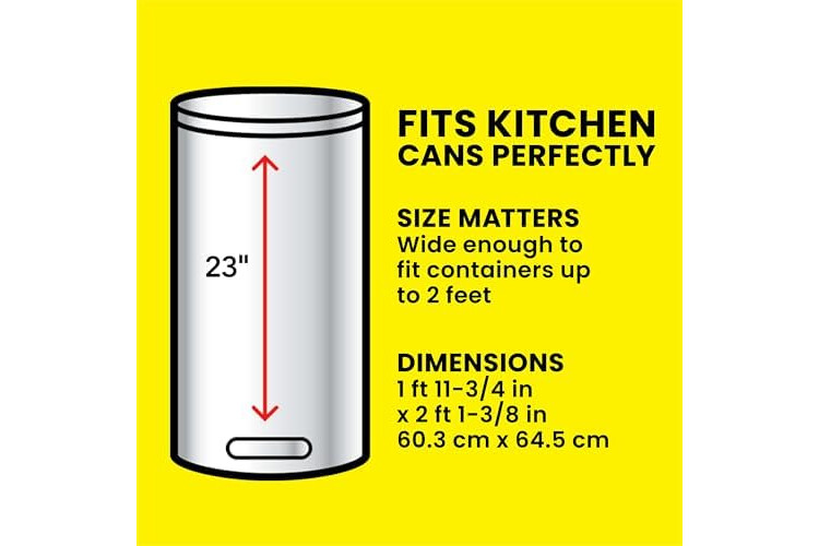 13 GALLON TALL GARBAGE BAGS: Each Glad ForceFlex bag measures 1 foot 11 15/32 inches by 2 feet 1 3/8 inches, making it just the right size for most slim kitchen garbage cans
