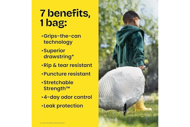 GRIPS THE CAN DRAWSTRING: The durable 3-ply drawstring design grips the can so the bag stays in place, and makes it easy to close and easy to carry out the trash, with no fear of leaks or tears