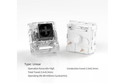 [Product parameters]: Linear feel | Operation Force:60±10gf;Conduction travel:2.0±0.3mm;Total Travel:3.6±0.3mm;Operating life:80 millions Cycles(min).