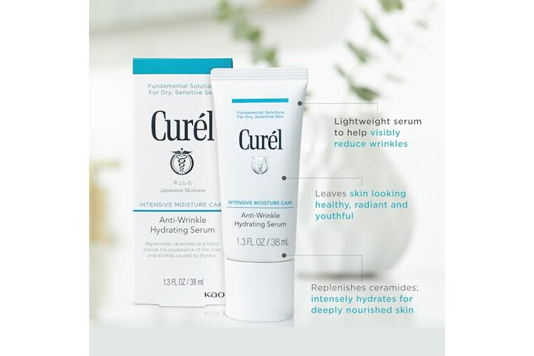 Curel Japanese Skin Care Anti-Wrinkle Hydrating Serum, Face moisturizer for Dry, Sensitive Skin, Reduces Wrinkles and Fine Lines, with Ceramides, Fragrance & Alcohol Free Facial Serum, 1.3 Fl Oz
