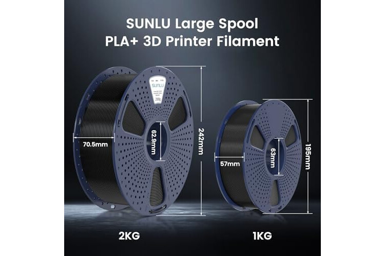 【2kg Large Spool for Large Project】- Spool Diameter: 242mm, Reel Width: 70.5mm, Spool Hub Hole Diameter: 63mm. The size of SUNLU PLA+ filament large spool is suitable for hanging on many 3D printers. Print large models without frequent filament changes.