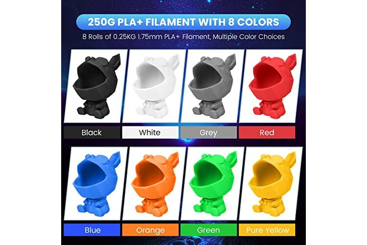 【2kg in Total, 0.25kg per Spool, 8 Rolls of 0.25kg 1.75mm PLA+ Filament】8 rolls of 250g SUNLU 1.75mm PLA plus filament. Color: Black+White+Grey+Blue+Green+Red+Orange+PureYellow. The design of 250g PLA+ filament is convenient for customers with multiple color needs.Especially for multi-nozzle 3d printer users and 3d pen users.