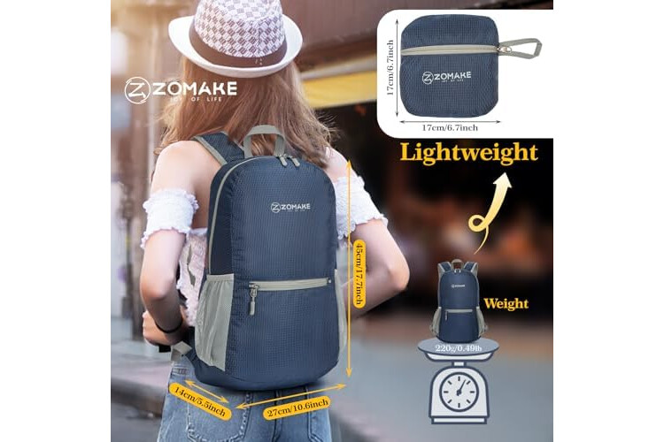 0.5 POUNDS OF PORTABLE ULTRA LIGHTWEIGHT PACKABLE BACKPACK: The size of the travel backpack packable is 17.71 x5.5x 10.6 inches,and the folding size is 6.7 x 6.7 x 1.97 inches.The lightweight foldable backpack is an ideal luggage bag for a plane.When it is not used,fold it into a compact pocket (sandwiches size).It can be stored in anywhere in pockets,luggage,handbags,etc