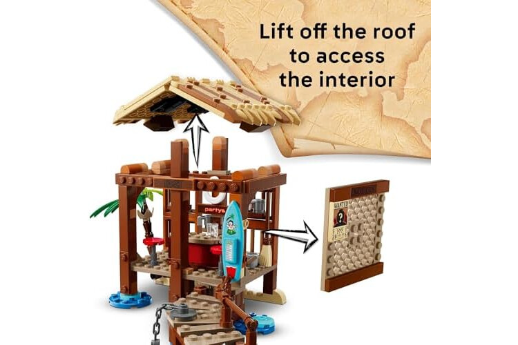 STOCK UP AT THE STORE – Removable roof reveals a seaside shop interior with authentic accessories while outside, a pirate boat waits to set sail