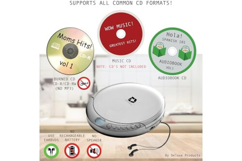 Plays All Formats - The Portable CD Player is easy to use and plays back your favourite Music CD, CD Audio books, Kids CD Disc, Recordable CDs CD-R, or ReWritable CDs CD-RW. NOTE: Does not support the MP3 CD's