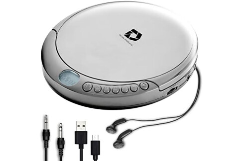 CD Player Portable with 60 Second Anti Skip, Stereo Earbuds, Includes Aux in Cable and AC USB Power Cable for use at Home or in Car. Silver
