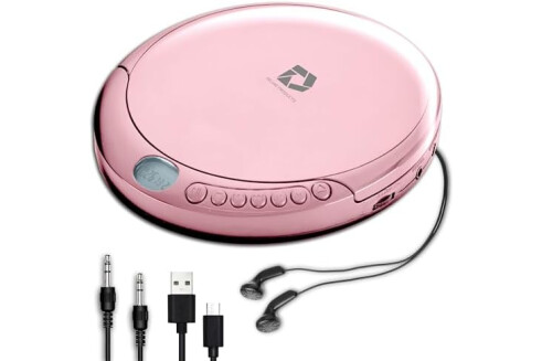 CD Player Portable with 60 Second Anti Skip, Stereo Earbuds, Includes Aux in Cable and AC USB Power Cable for use at Home or in Car. Pink