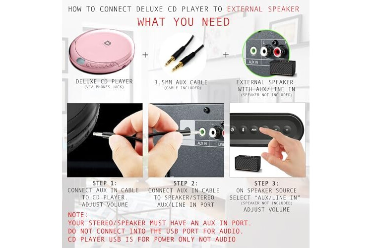 Connect to Your Speaker or Car - Using the INCLUDED 3.5mm Aux in cable you can easily connect your Deluxe CD Players for home to your favourite speaker, or car! CAR AUDIO PLAYBACK USING ONLY AUX IN. USB PORT IS FOR POWER ONLY (NOT AUDIO)