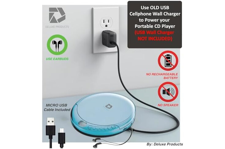 Long Battery Life - The discman CD player Uses 2 x AA Batteries (Batteries not included) – or You can power your portable cd players using the INCLUDED AC USB Cable (Smartphone USB wall adapter – NOT INCLUDED)