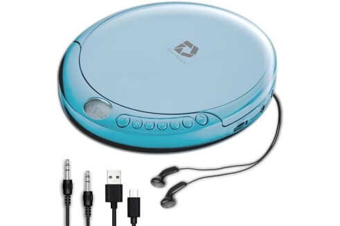 CD Player Portable with 60 Second Anti Skip, Stereo Earbuds, Includes Aux in Cable and AC USB Power Cable for use at Home or in Car. Blue