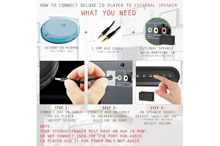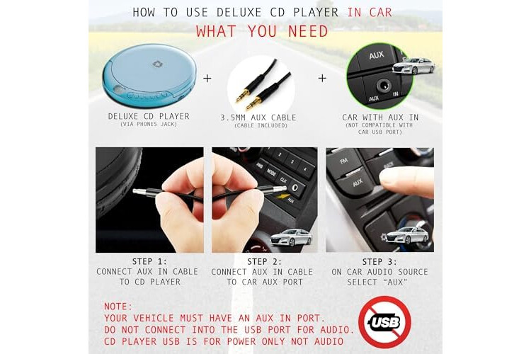 Connect to Your Speaker or Car - Using the INCLUDED 3.5mm Aux in cable you can easily connect your Deluxe CD Players for home to your favourite speaker, or car! CAR AUDIO PLAYBACK USING ONLY AUX IN. USB PORT IS FOR POWER ONLY (NOT AUDIO)
