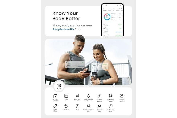 Detailed Body Analysis: Expand your health tracking by connecting this smart scale with the Renpho Health App, where you can analyze 13 detailed body metrics, observe long-term body trends, and set customized weight or body fat goals for a seamlessly integrated health management experience.