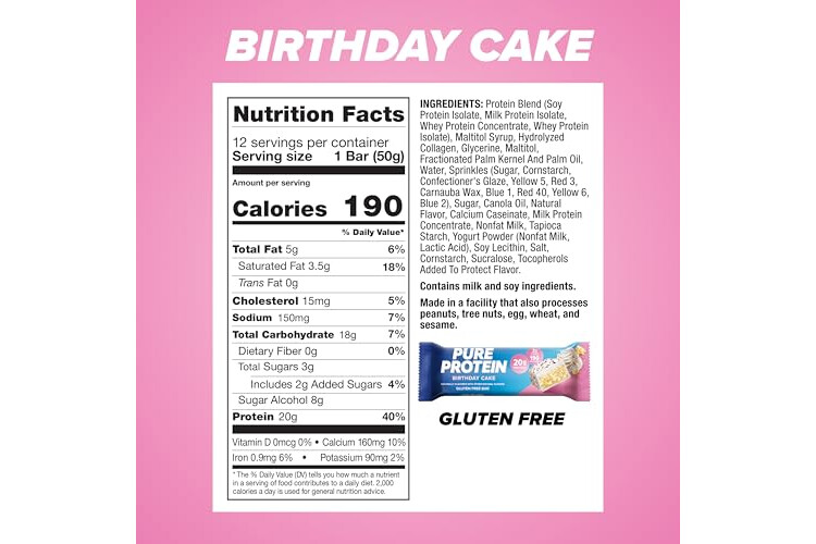 DELICIOUS HIGH PROTEIN BAR: Pure Protein Birthday Cake Bars are full of flavor and contain 20g of protein for lasting energy. Each delicious bar is gluten free with high-quality protein that helps build lean muscle and strength.