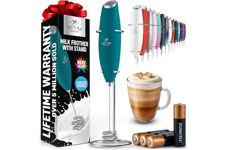 Zulay Kitchen Patented Tornado Triple Whisk Milk Frother with 4 Duracell Batteries – Handheld Foam Maker for Coffee, Lattes, Matcha & Hot Chocolate – Rich, Creamy Froth in Seconds