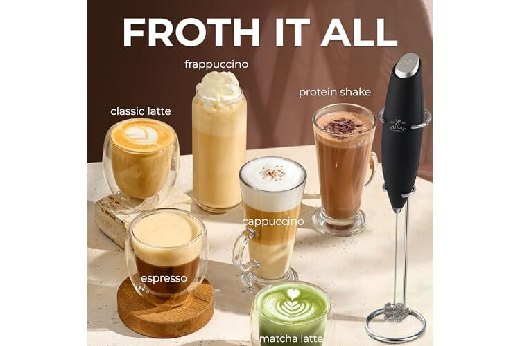 MAKE RICH, CREAMY FROTH IN SECONDS: Create café-quality foam for coffee, lattes, cappuccinos, hot chocolate, and matcha with this handheld frother wand. Perfect for milk, cream, or non-dairy alternatives.