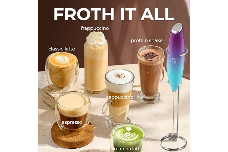 • MAKE RICH, CREAMY FROTH IN SECONDS: Create café-quality foam for coffee, lattes, cappuccinos, hot chocolate, and matcha with this handheld frother wand. Perfect for milk, cream, or non-dairy alternatives.