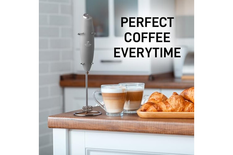 EASY TO CLEAN & STORE: Rinse the whisk under hot water and briefly turn it on for instant cleanup. The included metal stand keeps your frother wand organized and ready on counters or tables.