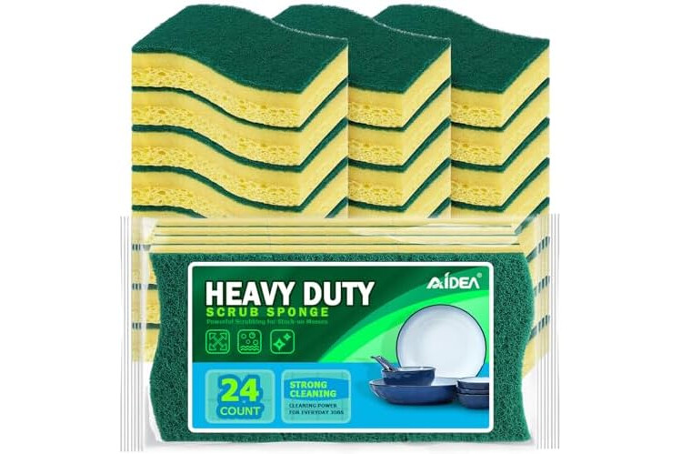 AIDEA Heavy-Duty Scrub Sponges, 24Count, Sponge for Non-Coated Cookware, Kitchen Sponges for Dishes, Scrubbing Power for Tough Messes, Cleaning Sponge for Kitchen, Bathroom, Household