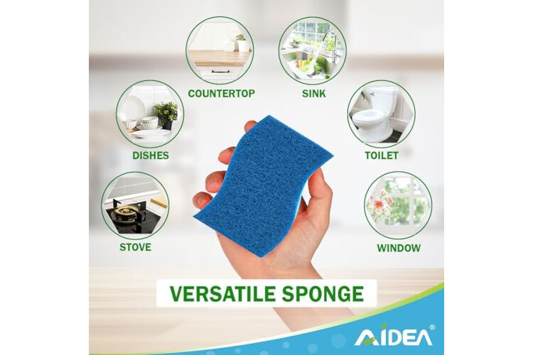 Built to Last: AIDEA cleaning sponges feature a scouring pad on one side and an absorbent sponge on the other; resistant to tearing and wear; suitable for removing tough, burned food stains; endure numerous uses