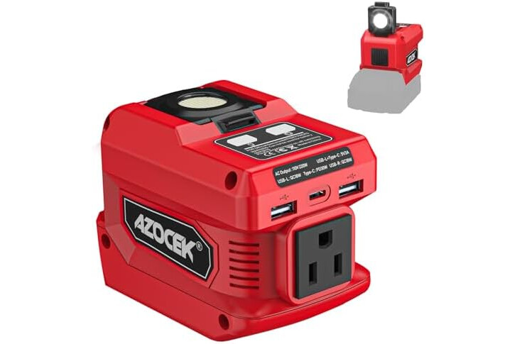 220W Azocek Power Inverter Compatible with Milwaukee 18V Battery, DC 18V to AC 110V Portable Power Station with 1 AC Outlet, 2 USB Ports & 1 Type-C Fast Charging, 400LM LED Work Light