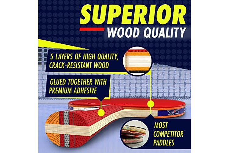 QUALITY MATERIALS - Each ping pong racket consists of 5 layers of high-quality crack-resistant wood. The flared ping pong paddle handle fits most palms smoothly for a great, sweat-free grip.