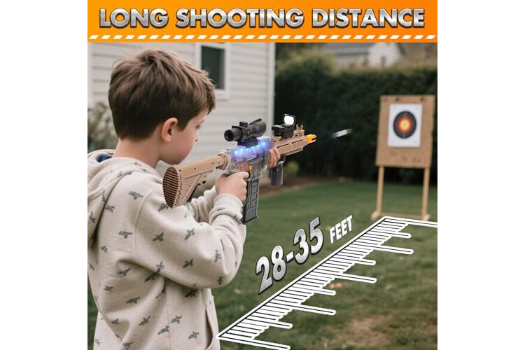 [New Upgrade in 2025]: The motor has been upgraded, and the shooting range has reached 35 feet. And it has reduced noise by 10% compared to before, and now it is quieter.Equipped with 2 batteries, the gaming time is longer.Upgraded the size, the toy rifle is bigger.Upgraded trigger, now lighter.