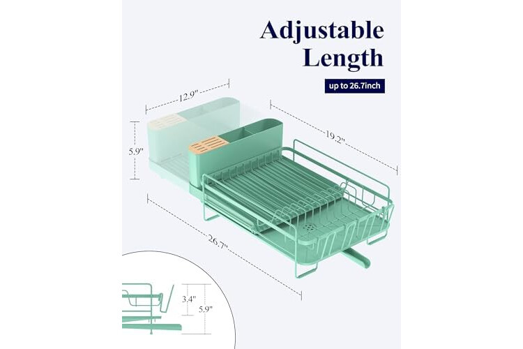 Kitsure Large Dish Drying Rack - Extendable Dish Rack, Multifunctional Dish Rack for Kitchen Counter, Anti-Rust Dish Drainers with Cutlery & Cup Holders 19.2"-26.7" L x 12.9" W, Green