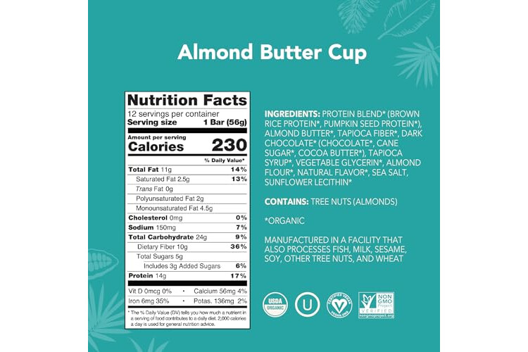 Box contains 12 - 1.98 ounce Organic Plant Based Almond Butter Cup Protein Bars