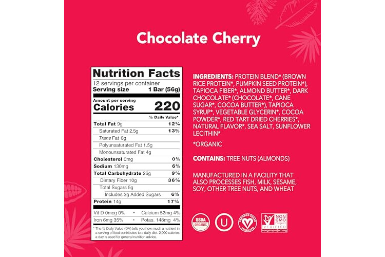 Box contains 12 - 1.98 ounce Organic Chocolate Cherry Plant Based Protein Bars