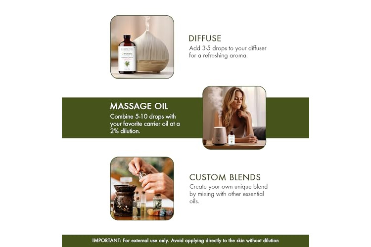 CITRONELLA OIL BLENDS WELL WITH – Basil, Cajeput, Cedarwood, Citronella, Frankincense, Ginger, Lavender, Lemon, Spearmint and Tea Tree, Wintergreen, Rosemary, Tea Tree, Pine, Lime.