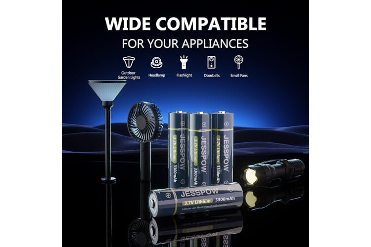 Wide Compatibility: 3.7 Volt rechargeable battery compatible for high power devices, such as headlamp, flashlight, radio, cameras, doorbells, LED lights, solar lights, toys, small fans, RC car, headlights, etc.