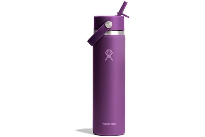 24 OZ BEACHPLUM PURPLE BOTTLE: Flip it and sip it with the Hydro Flask Wide Mouth insulated water bottle with closeable straw cap. With a comfortable, flexible handle, the leakproof straw cap is easy to open and close with one hand. Double-wall insulation keeps drinks cold up to 24 hours.