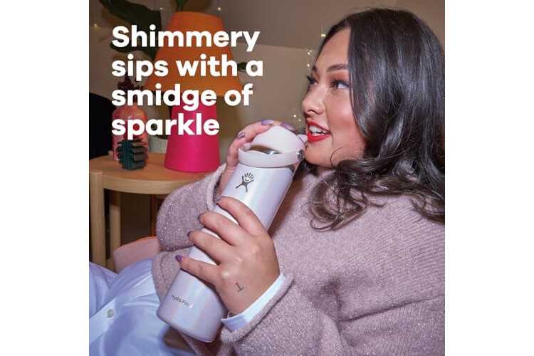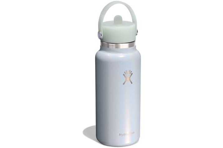 32 OZ GLIMMER BLUE BOTTLE: Flip it and sip it with the Hydro Flask Wide Mouth insulated water bottle with closeable straw cap. With a comfortable, flexible handle, the leakproof straw cap is easy to open and close. Double-wall insulation keeps drinks cold up to 24 hours.