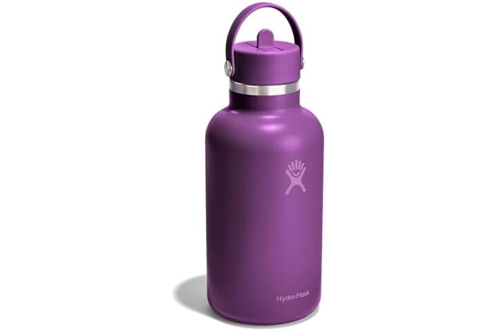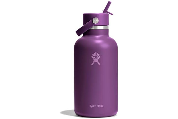 64 OZ BEACHPLUM PURPLE BOTTLE: Flip it and sip it with the Hydro Flask Wide Mouth insulated water bottle with closeable straw cap. With a comfortable, flexible handle, the leakproof straw cap is easy to open and close, for on-demand hydration. Double-wall insulation keeps drinks cold up to 24 hours.