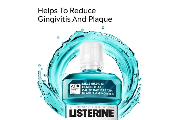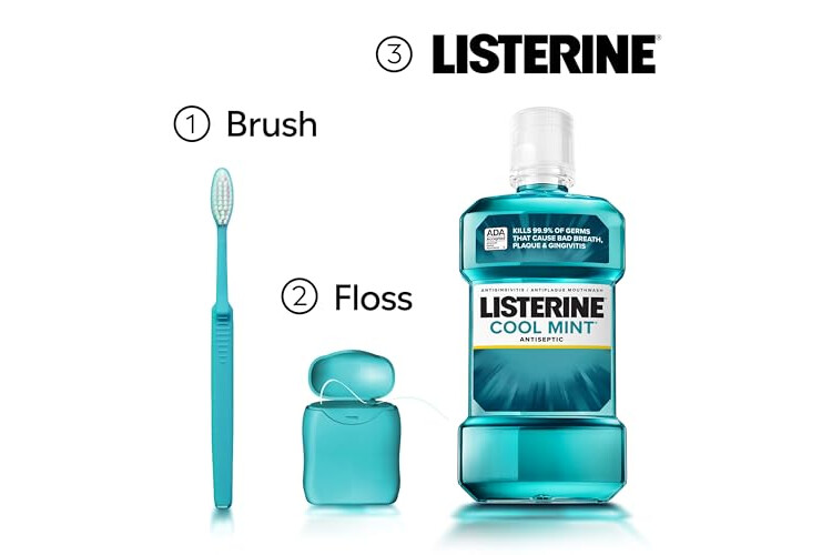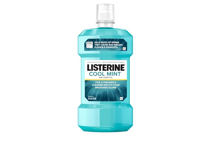Mouthwash for adults: 1-liter bottle of Listerine Cool Mint Antiseptic Mouthwash. Oral rinse kills 99.9% of germs that cause bad breath, plaque and gingivitis for a fresher and cleaner mouth than brushing alone