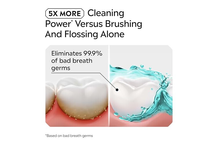 Combat bad breath and plaque: A germ-killing mouthwash, 5x more cleaning power than brushing and flossing alone, based on bad breath germs