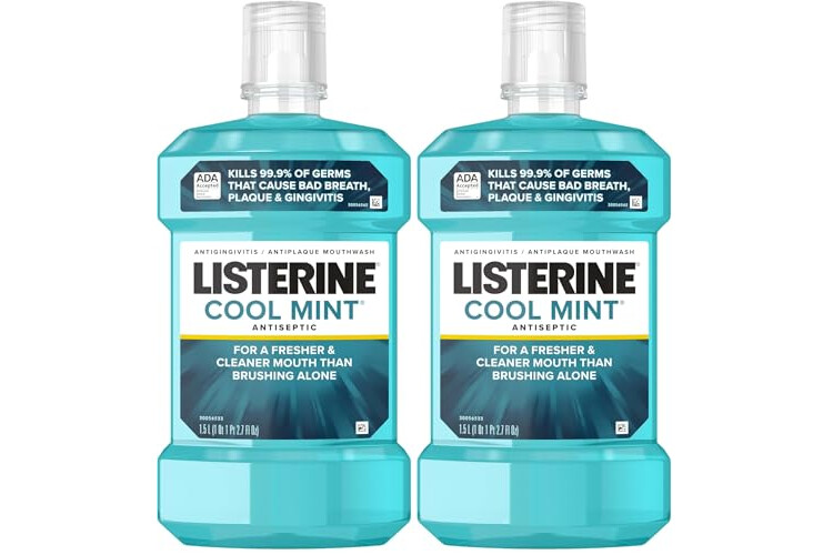 1.5-liter bottle of Listerine Cool Mint Antiseptic Mouthwash. Oral rinse kills 99.9% of germs that cause bad breath, plaque and gingivitis for a fresher and cleaner mouth than brushing alone