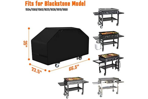 Sized for most 4 burner flat top Griddle: 66.5" (width)x22.5" (depth)x35"(height), this griddle cover is sized for Blackstone 36" Outdoor Cooking Gas Grill Griddle Model 1554/1825/1560/1565/1836, Blackstone 1819 Griddle Charcoal Combo, Blackstone 1868 36" Griddle With Air Fryer, Weber 36“ Griddle, Camp Chef(such as FTG600), Weber 36" Griddle 44310401 and most 4 burner flat top grill griddle. Does not fit for Blackstone 36”ProSeries Griddle